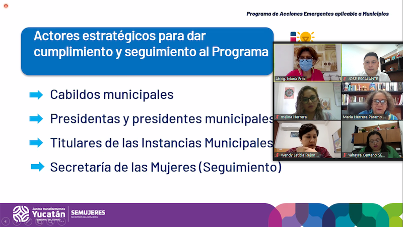 Compartir Fritz Sierra presenta programa en materia de prevención, atención integral y acceso a la justicia a implementarse a nivel municipal.Instancias municipales sumarán esfuerzos por la seguridad e integridad de este sector de la población.Mérida, Yucatán, 21 de febrero del 2021.- Como parte de la instrucción del Gobernador Mauricio Vila Dosal de reforzar las medidas preventivas y punitivas para hacer frente a la violencia de género, con el objetivo de erradicarla, la titular de la Secretaría General de Gobierno (SGG), María Fritz Sierra presentó el Programa de Acciones Emergentes para el Acceso de las Mujeres a sus Derechos en Municipios.En cumplimiento y continuidad del Acuerdo de Acciones Estratégicas contra la Violencia hacia las Mujeres, suscrito en noviembre pasado por el Ejecutivo estatal y 15 ayuntamientos, la funcionaria, junto con la titular de la Secretaría de las Mujeres (Semujeres), María Herrera Páramo, anunció la implementación del esquema que tiene como ejes la prevención, atención integral, acceso a la justicia y la institucionalización y actualización normativa, mediante la capacitación y el acompañamiento.Los municipios de Mérida, Tekax, Ticul, Progreso, Umán, Tizimín, Valladolid, Peto, Hunucmá, Maxcanú, Conkal, Seyé, Celestún, Teabo y Tekantó asumieron el compromiso de trabajar en suma de esfuerzos para la atención de la violencia de género con la reducción del rezago en el acceso a la justicia, los servicios de prevención, asistencia integral y orientación gratuita mediante las Instancias Municipales de las Mujeres.En un encuentro virtual con representantes de dichas demarcaciones, se dio a conocer a detalle el programa emergente como resultado del trabajo coordinado de la SGG con la Semujeres, a implementarse de manera inmediata en aras de garantizar a las víctimas el acceso y respeto a sus derechos.Durante la presentación, Fritz Sierra y Herrera Páramo calificaron el hecho como «histórica oportunidad» de fortalecer la vinculación y el trabajo colaborativo desde la municipalidad, a favor de la seguridad e integridad de la población femenina.El propósito principal es incidir de forma activa en la prevención, atención, sanción y erradicación de la violencia contra las mujeres, lo que responde al interés de la actual administración de atender los problemas que más afectan a la sociedad yucateca en general, en particular el tema que nos ocupa, manifestaron.Fritz Sierra reconoció que la atención a dicha problemática de salud pública y estructural representa un desafío mayor ante las condiciones actuales que impone la pandemia de Covid-19, por lo que es muy importante que los actores estratégicos abonen para erradicarla.Ante el director General del Instituto de Desarrollo Regional y Municipal (Inderm), Ricardo Alcocer Zapata, la titular de la SGG indicó que las acciones implementadas tendrán monitoreo y seguimiento de la Semujeres, dependencia que se encargará de brindar el acompañamiento necesario.En materia de prevención, la citada dependencia estatal impartirá capacitación sobre «Conceptos básicos de género, derechos de las mujeres a una vida libre de violencia y perspectiva de género e igualdad entre mujeres y hombres», de manera paralela los ayuntamientos tendrán a su disposición las campañas que desplegará el Gobierno del Estado sobre esos temas.En atención integral, los municipios podrán adoptar el Modelo de Atención a Mujeres Víctimas de Violencia para el Estado de Yucatán (MAVY), que contiene las herramientas para crear o mejorar las rutas de atención desde los contextos y necesidades del municipio.En acceso a la justicia, se fortalecerá la coordinación con los Poderes Ejecutivo y Judicial del Estado, así como la vinculación con dependencias estratégicas que permitan mejorar las rutas municipales para la actuación inmediata ante casos de feminicidios, violencia sexual y violencia intrafamiliar.Para ello, se les entregará la iniciativa aplicable para sus Bandos de Policía y recibirán la asesoría de la Dirección de Asuntos Jurídicos de la Semujeres para la instalación de sus Sistemas Municipales para prevenir, atender, sancionar y erradicar la violencia de género.La institucionalización y actualización normativa se basa en incluir en el Bando de Policía y Gobierno el apartado «Acceso de las Mujeres a sus Derechos» y rendir informes trimestrales a la Semujeres con respecto al número de mujeres atendidas y los servicios de atención jurídica y psicológica otorgados, a través de las Instancias Municipales de las Mujeres y/o el DIF Municipal.Fritz Sierra manifestó que este 2021 a pesar de ser todavía una época por demás difícil, a causa de la contingencia sanitaria, en Yucatán se establece un precedente en el fortalecimiento de la prevención y atención de la violencia de género.En este contexto, destacó como un acto de congruencia que el titular del Ejecutivo estatal, tal como lo anunció en su Segundo Informe de Resultados, haya turnado al Congreso una iniciativa para endurecer las penas al delito de feminicidio con modificaciones al Código Penal y a la Ley de Acceso de las Mujeres a una Vida Libre de Violencia del Estado.De igual manera, expuso que a principios de este año se estableció la Agenda Estratégica para la Prevención, Atención y Sanción de la Violencia contra Mujeres y Niñas en el Estado y quedó instalado el Consejo Consultivo del Sistema Estatal para la Igualdad entre Mujeres y Hombres.»El compromiso del Gobierno del Estado es seguir generando estrategias que coadyuven al ejercicio pleno de los derechos humanos de las mujeres y la garantía de una vida libre de violencia en todo Yucatán», puntualizó la titular de la SGG. Navegación de entradas Fuerzas básicas de los Venados de Yucatán conocen más de la cultura de nuestro estado El Gobernador Mauricio Vila Dosal continúa apoyando a los pescadores yucatecos
