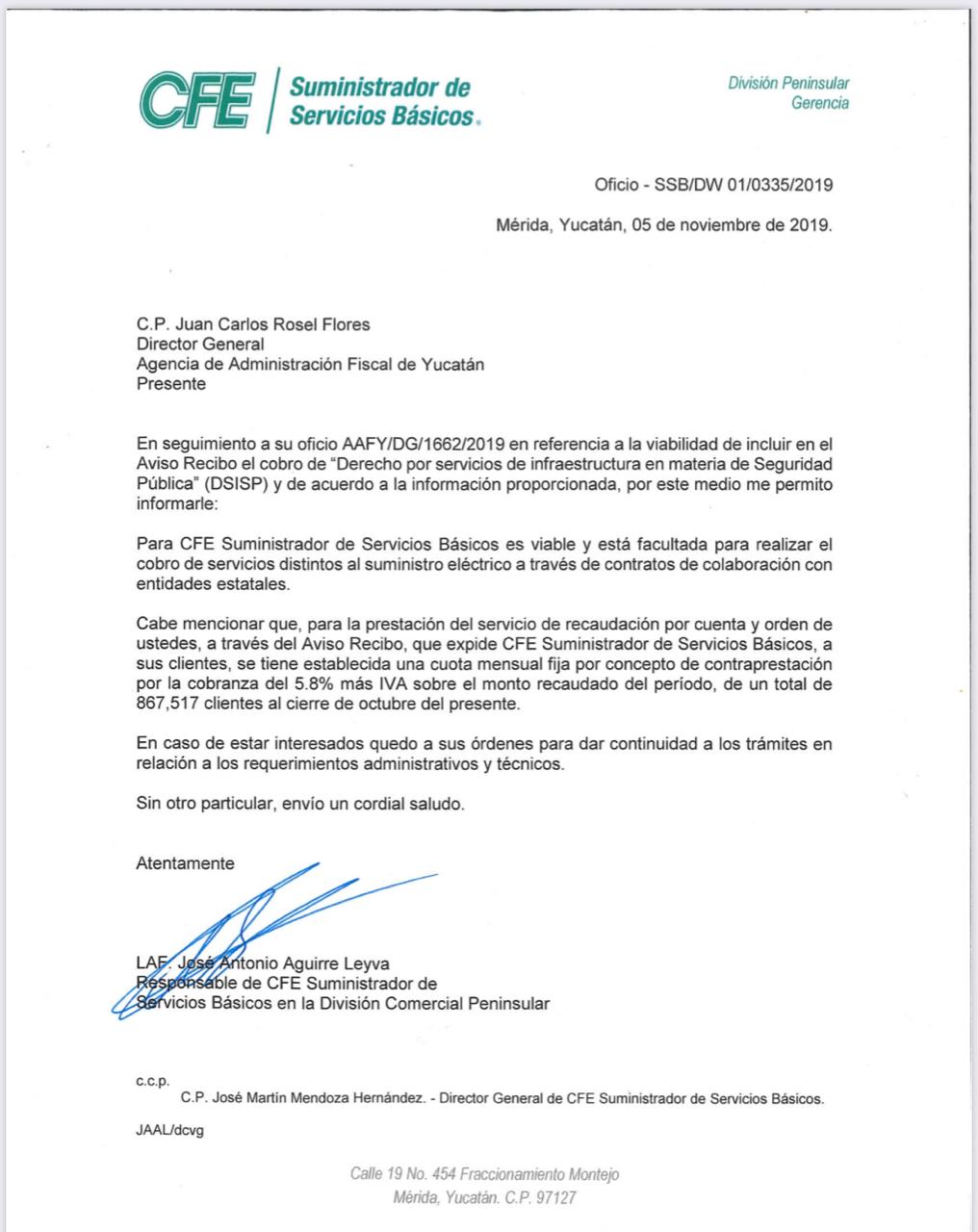En oficio SSB/DW 01/0335/2019, con fecha 5 de noviembre de 2019, José Antonio Aguirre Leyva, responsable de la Comisión Federal de Electricidad (CFE) Suministrador de Servicios Básicos en la División Comercial Peninsular, responde que “la CFE […] considera que es viable y está facultada para realizar el cobro de servicios distintos al suministro eléctrico a través de contratos de colaboración con entidades estatales”.