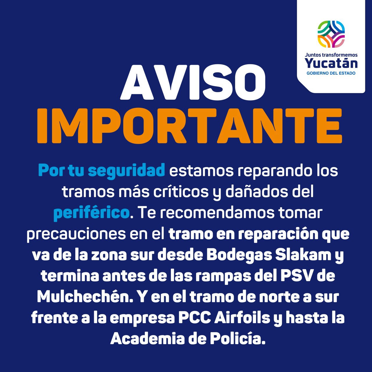 Compartir El Gobierno del Estado informó que, a partir del martes 28 de diciembre, comenzarán los trabajos en otros tramos del cuerpo exterior de esta parte de la vía, al sur de la capital, y se espera que concluyan en 15 días.Por ello, se les solicita a las personas tomar sus precauciones y se anuncia que estas obras no causarán el cierre a la circulación Mérida, Yucatán, 27 de diciembre de 2021.- Por instrucciones del Gobernador Mauricio Vila Dosal, continúan los trabajos de rehabilitación en 10 kilómetros más del Anillo Periférico de Mérida, que se suman a las obras de repavimentación de 13.5 kilómetros críticos que se efectuaron recientemente en esta importante arteria, con lo que acumulará más de 23 kilómetros intervenidos durante la administración actual, a pesar de que tal vía pertenece al ámbito federal. El Gobierno del Estado informó que, a partir del martes 28 de diciembre, comenzarán los trabajos en otros tramos del cuerpo exterior de la zona sur del Periférico, a fin de otorgar una movilidad más segura y eficiente de las familias yucatecas, por lo que se solicita a las personas tomar sus precauciones ante estas obras que no ocasionarán el cierre a la circulación y que se espera concluyan en un periodo de 15 días. Respecto de los trabajos que se llevarán a cabo, el Gobierno estatal detalló que continuará la repavimentación de 10 kilómetros críticos, y en esta ocasión, se mejora el tramo del cuerpo exterior de esta vía, que va del kilómetro 11+750, ubicado a 256 metros del inicio de la rampa de bajada del paso superior vehicular de Mulchechén, al kilómetro 13+150 ubicado a 50 metros antes del inicio de la rampa de acceso del mismo paso vehicular. Además, se intervendrá el tramo de cuerpo exterior de esta arteria, que parte del kilómetro 48+500, localizado frente a la empresa PCC Airfoils, hasta el kilómetro 49+500, bajo el paso inferior vehicular de Umán. De igual manera, se rehabilitará la sección del cuerpo exterior, que corre desde el kilómetro 0+000, bajo el paso inferior vehicular de Umán, al kilómetro 0+150, frente a la Academia de Policías. Cabe recordar que, como parte del Programa Conjunto de Mejora a la Movilidad y la Infraestructura Vial, que impulsa el Gobierno del Estado, recientemente, se atendió 13.5 kilómetros críticos del Periférico, a los cuales se sumó otros 10.3 kilómetros de esta importante arteria, alcanzando más de 23 kilómetros intervenidos durante la administración actual. Previamente, se informó sobre los trabajos similares realizados en el tramo que inicia en el kilómetro 7+400, después del paso superior peatonal al kilómetro 9+200, 100 metros antes de subir al paso superior vehicular Xmatkuil, así como en el tramo que parte del kilómetro 9+800, antes de la rampa de bajada del paso superior vehicular de Xmatkuil hasta el kilómetro 11+250, frente a las bodegas de Slakami. También, se intervino los tramos ubicados en la zona sur del cuerpo exterior del Periférico, que van del kilómetro 11+750, en la entrada a la 42 Sur, hasta el kilómetro 13+150, 50 metros antes de la rampa en la entrada a Mulchechén. Asimismo, del kilómetro 48+500 frente a la empresa PCC Airfoils, hasta el 49+500, bajo el paso inferior vehicular de Umán. Por último, del 48+500 al 0+150 frente a la Academia de Policía. En cuanto a la zona norte del cuerpo interior de la vía, los tramos del kilómetro 38+100, frente a la tienda de antigüedades Anacronía, al kilómetro 36+900, a un lado del centro comercial Papelería del Ahorro. También, del kilómetro 30+500, a la altura de la entrada a la comisaría de Temozón Norte, al kilómetro 28+900, frente a la plaza comercial City Center y del kilómetro 27+640, a 200 metros de la Torre Orión, hasta el 25+940, después de la gasolinera Gulf de Montecarlo. Los trabajos que se realizan consisten en fresado, renivelación, colocación de carpeta de concreto y señalamientos, informó el Gobierno del Estado, y forman parte de las acciones de mejora a la movilidad impulsadas por el Gobernador Mauricio Vila Dosal, y entre las que se encuentran las ciclovías, así como las obras de infraestructura efectuadas para garantizar la seguridad de peatones y usuarios de la Ruta Periférico del sistema de transporte “Va y ven”, que se puso en marcha en días pasados. Navegación de entradas Gobierno de Mauricio Vila Dosal ha destinado más de 300 millones de pesos para impulsar a los emprendedores yucatecos y generar empleos Arriban a Yucatán 72,440 vacunas contra el Coronavirus para la aplicación de la dosis de refuerzo a personal de salud del estado