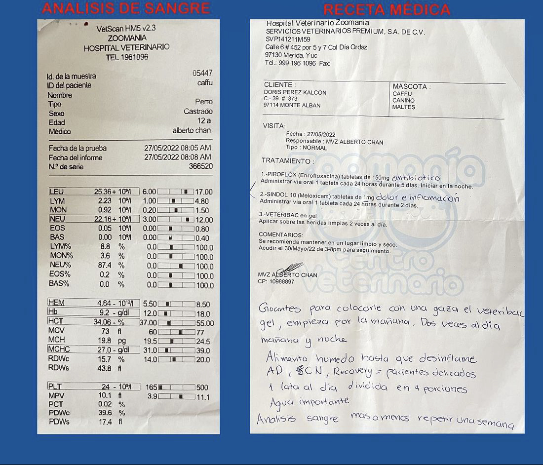 Ya han salido varios reportes a la luz acerca de los tratos en la ciudad de Merida por parte de esta compañía veterinaria llamada Zoomania. Se ha hecho viral los reportes por parte de una familia que ha pasado por la experiencia traumatica de casi perder a alguien que ellos concideran un miembro. El dia 22 de Mayo un perrito con el nombre de caffu sufrio de un accidente que le lastimo el cuello, la familia desesperada por ayuda medica acudieron a la clinica veterinaria de zoomania en la cual caffu seria supuestamente tratado, despues de dias de “cuidado” y de haberles hecho incoherencias a la familia por parte de la clinica se les hablo para ir a recoger a caffu a la clinica, al momento de ir por el, la señora noto algo raro en su pequeño integrante ya que no parecia curado y se le veia inflamado de la cabeza, por la tarde no vieron mejoria en caffu asi que decidieron atender a otra clinica veterinaria. En esta otra clinica con el nombre de Planed pethood la familia fue informada que su perrito se encontraba en una condicion deplorable y que se encontraba peor que nunca, tenia pedasos de piel grravemente infectados, anemia y falta de globulos rojos.