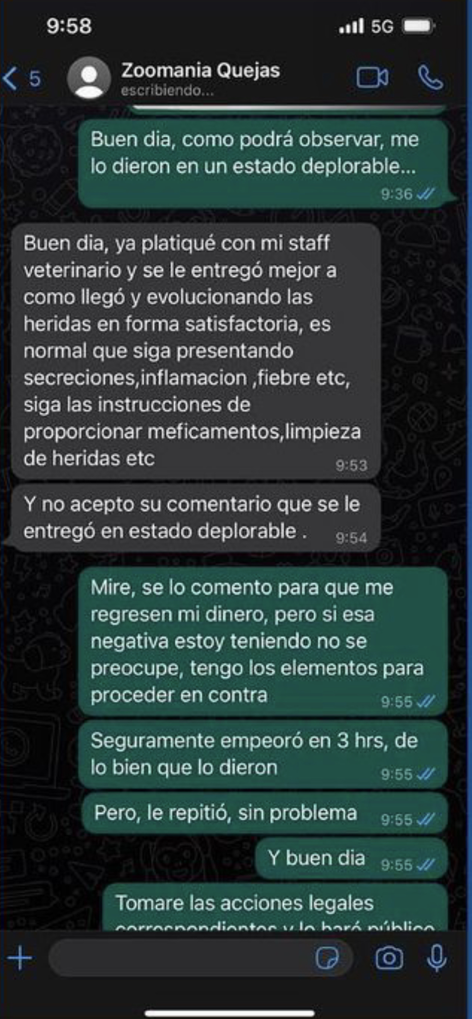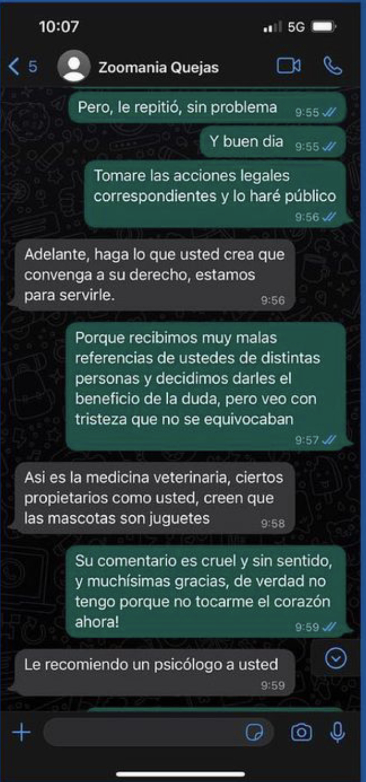 Luego de los problemas con zoomsnia y de llevar a caffu a el otro sitio la dueña de caffu trato de contactar a zoomania y la zona de quejas la cual no contesto por dias, luego de esto se le informo a la señora que el propietario de ese numero era el mismo dueño de la veterinaria la cual aun la señora portandose muy amable y tranquila fue insultada y agredida verbalmente por el dueño del lugar. La señora hasta el dia de hoy no recupera su dinero y no se ha hecho nada al respecto de estos casos que no son primera vez que pasan con esta compañia.