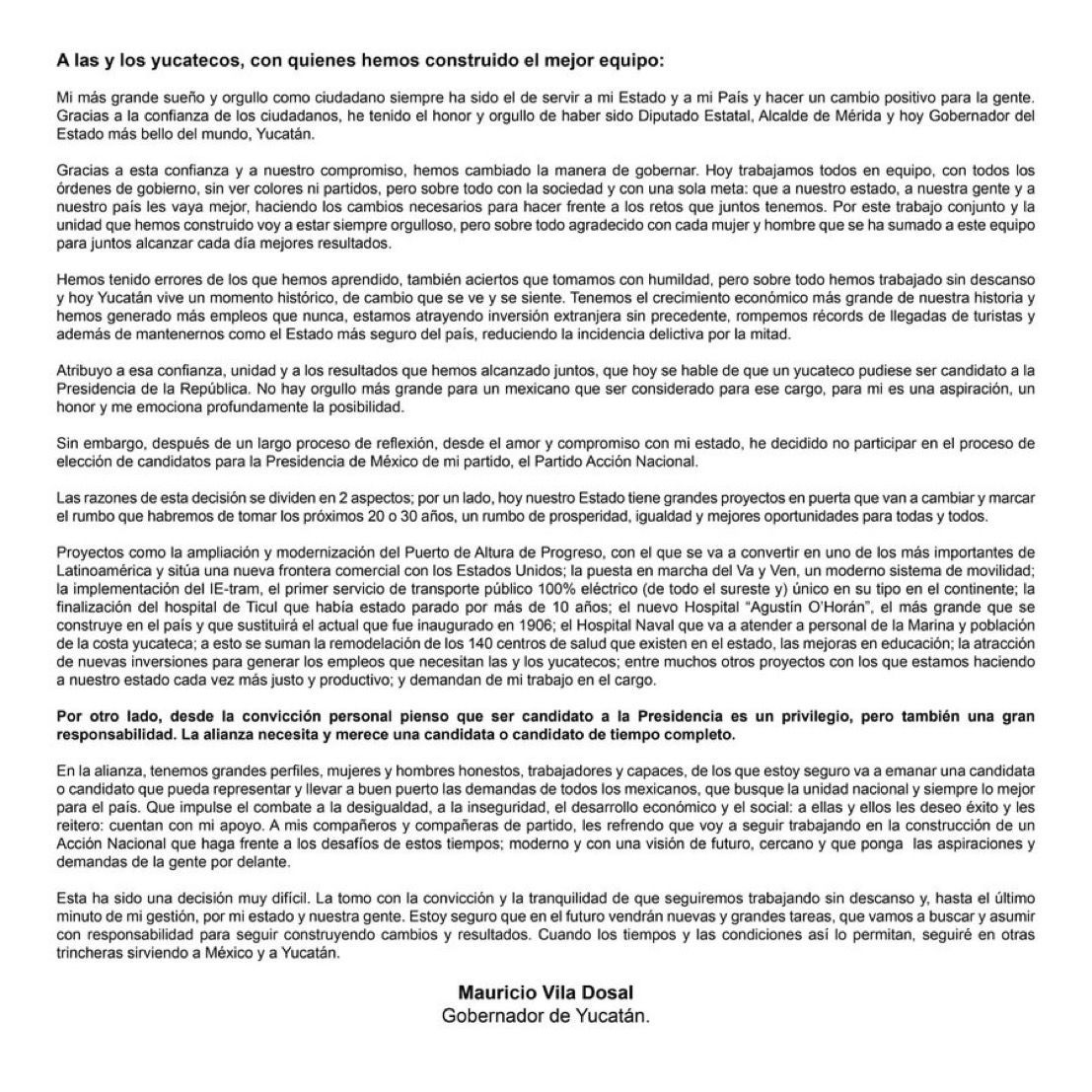Compartir -Hay proyectos en marcha que van a marcar una ruta de cambio, justicia y oportunidades por los próximos 30 años y requieren mi trabajo y presencia. Mauricio Vila -Vila abre la puerta a que en un futuro haya presidente yucateco.-Nunca más se verá como ingenuo en el resto del país que un yucateco busque la presidencia. Navegación de entradas Vila Dosal y Renán Barrera coinciden en la necesidad de hacer equipo con el sector privado para mejorar las condiciones de Yucatán Finaliza con éxito el primer Torneo de Sóftbol Femenil Estatal “Liga del Cambio”