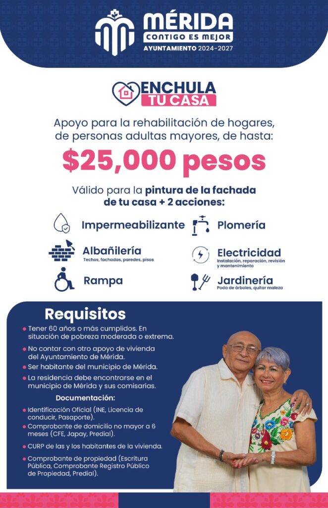 Compartir Cómo parte de los primeros 100 días de acción por una Mérida más justa, solidaria y digna, la Presidenta Municipal Cecilia Patrón Laviada presentó el programa “Enchula tu Casa” para cambiar la vida y mejorar la vivienda de personas mayores que se encuentren en situación de abandono o de pobreza. “Viendo la necesidad de personas mayores, quienes están imposibilitados para dar mantenimiento a su hogar, en el Ayuntamiento implementamos esta nueva política pública para contribuir a qué tengan un hogar digno”, externó la Alcaldesa en su reunión semanal con los medios de comunicación. Consiste en mejorar la fachada, además de dos acciones de rehabilitación que pueden ser albañilería, impermeabilización, rampa para personas que utilicen la silla de ruedas o que tengan algún tipo de discapacidad, plomería, electricidad, poda y deshierbe. Para el cierre de 2024 serán 65 las casas que se intervendrán con 195 acciones de rehabilitación, con una inversión de 2 millones de pesos, y para el 2025 se brindará apoyo en 250 predios con 750 acciones, por 7 millones de pesos aproximadamente. “Hoy, con nuestras personas mayores de 60 años que viven en pobreza moderada o extrema nos comprometimos a mejorar su calidad de vida y lo cumplimos; los estamos cuidando como nunca, para que sean felices y retribuir el amor que han entregado por su ciudad”, puntualizó Cecilia Patrón. Los interesados podrán acudir hasta el 26 de noviembre a la Dirección de Desarrollo Social ubicada en la calle 65 número 368-Interior entre 40 y 42, Centro, y deberán presentar identificación oficial, comprobante de domicilio no mayor a tres meses, copia de CURP comprobante de posesión o propiedad, deberán ser habitantes y residir dentro del municipio de Mérida y no contar con otro apoyo de vivienda. En Mérida, 139 mil 677 personas son adultas mayores, que representan el 14.03 por ciento de la población, de las cuales 56.21 por ciento son mujeres, 43.79 por ciento son hombres. El Ayuntamiento de Mérida cuenta con programas que fortalecen, incluyen y protegen a este grupo etario con diversos servicios como Médico a Domicilio, el Centro Municipal de Atención Nutricional y Diabetes, así como espacios de esparcimiento en los Clubes Integrales Para Personas Mayores en las colonias El Roble y Renacimiento, así como Centros Integrales para la Plenitud de las Personas Mayores “Armonía” y “Renacer” en el oriente y poniente de la ciudad respectivamente. IMPULSO ECONÓMICO PARA TALENTOS LOCALES Para estimular y consolidar el trabajo artístico local, la Alcaldesa presentó también las convocatorias 2025 del Fondo Municipal Para Jóvenes Creadores y el Fondo Municipal para Creadores con Trayectoria, que consisten en apoyos que van de 25 mil a 80 mil pesos, y de 30 mil a 150 mil pesos, respectivamente, para la promoción, gestión o producción artística. “En Mérida la cultura es eje fundamental de la identidad comunitaria y la unidad en las y los meridanos, por eso este llamado a participar en estos dos fondos municipales a los jóvenes talentos y artistas con 15 años de trayectoria o más, de las disciplinas de artes escénicas, música, teatro, danza, arte circense e interdisciplinario, así como de artes visuales”, externó la munícipe. Los interesados podrán consultar las bases, fechas límites y montos en las categorías individual o grupal a través de la página web del Ayuntamiento de Mérida en www.merida.gob.mx/convocatoriascultura o en las oficinas de la Dirección de Identidad y Cultura. Cecilia reiteró la invitación las actividades de la Semana Meridana que ofrece diversidad de eventos culturales en el Centro Histórico de la ciudad, además de La Víspera y La Noche Blanca el viernes 29 y sábado 30 de noviembre, que en esta edición acercará el arte y la cultura a tope a las colonias y a las comisarías. AYUNTAMIENTO DE MÉRIDA CONTINÚA CON EL BUEN FIN. En el Ayuntamiento de Mérida el Buen Fin no ha terminado, continúa el 100% de descuentos en recargos y multas del predial hasta el próximo 29 de noviembre. La Presidenta Municipal invitó a la ciudadanía a aprovechar estos descuentos. Finalmente informó sobre el operativo de seguridad con motivo del Buen Fin en el Centro Histórico en el que 230 elementos de la Policía Municipal estuvieron atentos para cuidar y proteger a las y los meridanos. Se registraron 58 boletas de infracción, 17 detenidos por temas administrativos, 130 llamadas de auxilio, 212 atenciones por diversos motivos y dudas. Los paramédicos intervinieron a 40 personas que tuvieron algún malestar y hubo 30 hechos de tránsito. “En la proximidad social, los policías tenían la instrucción de acercarse a los negocios, acercarse a la gente, decirles que estaban pendientes, que lo que necesitaran, que ahí estaban para protegerlos y para cuidarlos” comentó la alcaldesa. “Agradezco a los más de 230 elementos policiales que estuvieron firmes, que estuvieron acompañando a los meridanos en estos días, siempre cuidando y protegiendo su economía e integridad” finalizó Cecilia Patrón. Navegación de entradas Díaz Mena refuerza justicia social con diálogo ciudadano Ley de Bienestar Energético busca hacer de Yucatán un polo energético