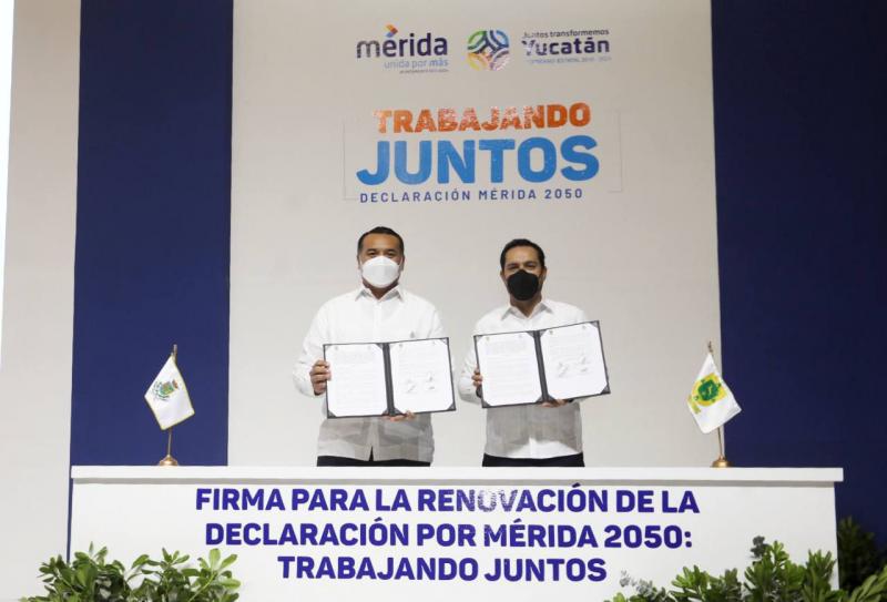 Compartir – Firmaron la renovación de la Declaración por Mérida 2050 «Trabajando juntos», agenda con visión de futuro que incluye una serie de acciones conjuntas, en diversos rubros. – Contempla seguridad, combate al rezago social, movilidad urbana, salud, mejora de espacios públicos, pavimentación, inversiones, simplificación de trámites, reforestación, empleo, mujeres y turismo. Mérida, Yucatán, 27 de abril de 2022.- Con el fin de continuar avanzando hacia un mejor futuro para los habitantes de Mérida y todas las familias del estado, el Gobernador Mauricio Vila Dosal y el alcalde Renán Barrera Concha firmaron la renovación de la Declaración por Mérida 2050 «Trabajando juntos», a partir de la cual impulsarán una agenda de acciones conjuntas, en diversos rubros, a favor de la gente. Vila Dosal y Barrera Concha encabezaron el relanzamiento de dicha firma en el Centro Internacional de Congresos (CIC), donde se acordó mantener la coordinación y la hoja de ruta, a la que se comprometieron al inicio de sus mandatos, para atender los temas importantes, que más preocupan y demandan las y los meridanos. Entre las metas establecidas, se contempla continuar arborizando la ciudad, con la siembra de 200,000 árboles más, antes de que culmine el 2024; la creación de un vivero municipal, y un nuevo hospital y refugio público para mascotas, como parte de las estrategias para la protección de los animales, de manera que reciban el trato y seguimiento que requieren. Durante su mensaje, Vila Dosal señaló que este documento refrenda el compromiso de su Gobierno y del Ayuntamiento de Mérida con la gente de la capital, y refleja la unidad que mantenemos en la entidad, valor que es una de las principales características que nos hacen diferentes al resto de la República. «Porque la unidad requiere muchas cosas: consenso, diálogo, pero, sobre todo, que tengamos un objetivo en común, para que podamos trabajar por el mismo fin, y los yucatecos somos afortunados de que tenemos una sociedad civil que comparte las mismas metas que sus autoridades», afirmó. Ante representantes de diversos sectores sociales, recordó que este compromiso surgió durante las campañas de ambos, cuando aún eran candidatos y acordaron que, si ganaban, trabajarían en fines comunes, las cuales se han cumplido y, con el relanzamiento de este día, se agregan nuevas. En ese sentido, el Gobernador explicó que la agenda es una hoja de ruta, de lo que se quiere que Mérida sea en los próximos años, especialmente ante el importante crecimiento y desarrollo que ha presentado, para evitar que se ponga en riesgo la calidad de vida de la gente, como en otras ciudades de México. Destacó la importancia de entender que nada puede estar por encima de un futuro sustentable, así que es responsabilidad de la población que estas políticas permanezcan en próximos gobiernos. «Vamos a tener que cambiar intereses personales y hacerlos a un lado, para evitar que se comprometa la ciudad; hoy, afortunadamente, existe el diálogo continuo entre sociedad civil, ciudadanía y autoridades», añadió. También, invitó a todos los yucatecos a sumarse a la Declaración 2050, para seguir transformando al territorio y haciendo grandes cambios, pero asegurando que estos no sean de una administración, sino de la gente, para que puedan durar a través del tiempo. «Que nuestras diferencias en formas de pensar no nos dividan y nadie de fuera venga a decirnos cómo hacer las cosas, porque el destino del estado lo tenemos que definir las y los yucatecos, y lo vamos a decidir dialogando y poniéndonos de acuerdo», recalcó. Finalmente, agradeció al alcalde por su disposición para actuar de forma rápida, eficiente y coordinada, al resolver las principales demandas de la gente, y externó que «acabamos de pasar la peor pandemia y una época atípica de fenómenos naturales, y no hubiéramos salido tan bien, salvado tantas vidas ni alcanzado una reactivación económica, sin el trabajo en equipo que hacemos en Yucatán». En su intervención, el Alcalde de Mérida, Renán Barrera Concha, aseguró que la «Agenda Mérida 2050, Trabajando Juntos» está más vigente que nunca, porque es fiel reflejo de esa Paz Cívica que encamina a Mérida y Yucatán a un futuro próspero, con armonía social basada en alianzas ciudadanas, donde todos los municipios yucatecos comparten sus esperanzas y sueños. De igual forma, refrendó su compromiso de continuar trabajando en conjunto con el Gobierno del Estado para seguir conservando los índices de paz que perciben los ciudadanos en el Municipio y así puedan encontrar opciones para su desarrollo personal y colectivo. «Esta relación de trabajar juntos, gobierno estatal y municipal sienta sus bases en un servicio cercano a la gente, con servicios públicos de calidad, con calles y parques bien iluminados y atendidos, con infraestructura urbana que abona a nuestra seguridad facilitando la convivencia que se refleja también en la felicidad de los ciudadanos. Esa es la paz cívica», aseveró. Bajo ese esquema, continuó, se ha logrado alcanzar acuerdos y consensos para la construcción de 120 kilómetros de nuevas calles al interior del Periférico, construcción y mejoramiento de parques y espacios públicos, además de fortalecer nuestra ciudad con programas a favor del empleo, la seguridad y la equidad de género, sin pasar por alto temas trascendentes como la reforestación, el transporte público, la mejora de los sistemas de seguridad y la promoción turística. Con esta agenda, Gobierno del Estado y Ayuntamiento trabajan de la mano, para responder a los retos de crecimiento acelerado que han experimentado Yucatán y Mérida, en los últimos 2 años; por el futuro que merecen sus habitantes, desarrollarán estrategias de seguridad, salud, combate al rezago social, movilidad urbana, mejora de espacios públicos, empleo, pavimentación, inversiones, simplificación de trámites, refo