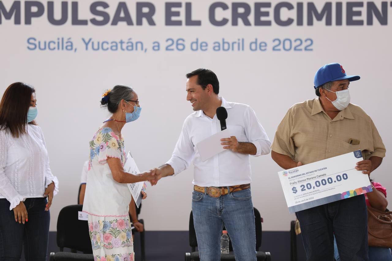 Sucilá, Yucatán, 30 de abril de 2022.- El respaldo a las familias que dependen de las labores del campo sigue llegando a todo el estado y, como muestra de ello, el Gobernador Mauricio Vila Dosal estuvo en Sucilá, distribuyendo apoyos para fortalecer las actividades ganaderas, agrícolas y apícolas.